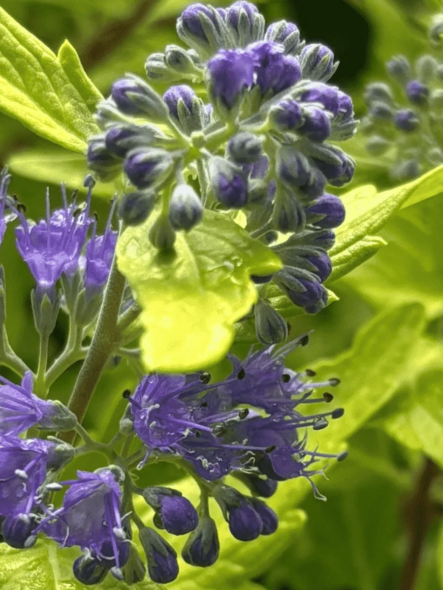 Кариоптерис кландоненский сорт 'Gold Crest' представляет собой компактный кустарник высотой до одного метра с густой кроной и прямостоячими побегами, покрытыми нежной бархатистостью. Листья мелкие, ланцетные, ярко-золотисто-жёлтые, словно солнечные блики, переливающиеся на солнце, создавая эффект сияния и свежести. Цветёт обильно и продолжительно, начиная с конца лета и вплоть до первых заморозков, покрываясь мелкими сиренево-голубыми цветами, собранными в плотные щитковидные соцветия, источающие тонкий аромат, привлекающий насекомых-опылителей. Растение отличается неприхотливостью, устойчиво к засухе и морозу, быстро восстанавливается после обрезки, легко размножается черенкованием и прекрасно подходит для оформления бордюров, миксбордеров и каменистых садов, привнося яркие краски и очарование даже поздней осенью.