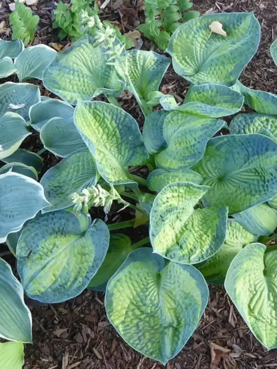 Хоста *Blue Shadows* пленяет взор своей изысканной красотой и благородством форм. Это многолетнее травянистое растение образует плотную розетку крупных сердцевидных листьев, словно вырезанных искусной рукой мастера. Листья покрыты нежнейшей голубовато-серебристой дымкой, оттенённой тонкой зелёной каймой, придающей растению особую элегантность и утончённость. Высота взрослого экземпляра достигает примерно полуметра, ширина розетки около метра, создавая живописные островки зелени среди тенистых уголков сада. Цветоносы возвышаются над листвой, украшая её мелкими колокольчатыми цветами нежно-лилового оттенка, источающими едва уловимый аромат. Растёт медленно, предпочитая полутень и влажные плодородные почвы, постепенно разрастаясь и формируя густые куртины, способные стать украшением любого ландшафтного дизайна.