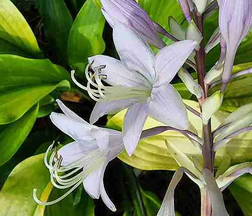 Хоста *Funky Monkey* пленяет взор своей изысканной декоративностью и утончённой красотой. Листья крупные, сердцевидные, слегка волнистые по краям, словно нежная рябь на поверхности тихого лесного озера. Их поверхность покрыта серебристо-голубым восковым налетом, придающим листьям загадочный перламутровый блеск, особенно заметный после дождя или утренней росы. Центральная жилка листа ярко выражена, контрастируя с общим голубовато-зелёным фоном и создавая эффектную игру света и тени. Цветки хосты *Funky Monkey*, возвышаясь над лиственной массой на стройных цветоносах высотой до полуметра, раскрываются мелкими колокольчиками нежно-лилового оттенка, источающими тонкий аромат, привлекающий насекомых-опылителей. Растение предпочитает полутень и влажные плодородные почвы, прекрасно адаптируясь к условиям средней полосы России и украшая тенистые уголки садов своим благородством и элегантностью.
