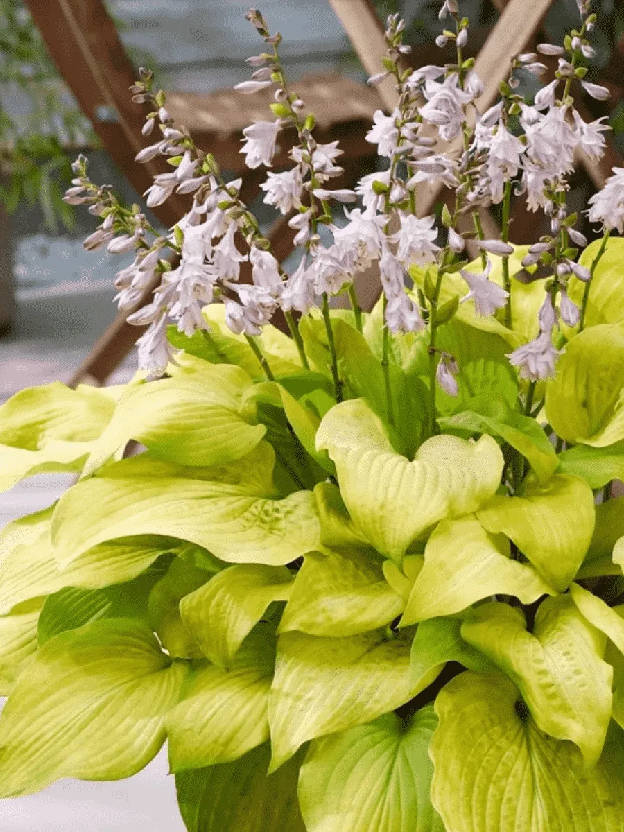 Хоста сорта *Ki Ren Jyaku* пленяет взор изысканным сочетанием золотисто-жёлтых и изумрудно-зелёных оттенков своей листвы, словно воплощением солнечного света, застывшего среди тенистых садов. Листья крупные, широкие, слегка волнистые по краям, образуют пышную розетку, возвышающуюся над поверхностью почвы подобно живописному зелёному фонтану. Центральная часть листа насыщенно жёлтая, плавно переходящая к краю в нежный салатовый оттенок, создавая эффект мягкого свечения даже в полутени. Цветки появляются летом, поднимаются на стройных цветоносах высотой до полуметра, раскрываясь небольшими колокольчатыми цветами нежно-лилового цвета, источающими тонкий аромат, привлекающий насекомых-опылителей. Растёт медленно, предпочитая влажные плодородные почвы и умеренное освещение, прекрасно адаптируясь к условиям российских садов и парков, где становится украшением затенённых уголков, даря прохладу и гармонию своим присутствием.