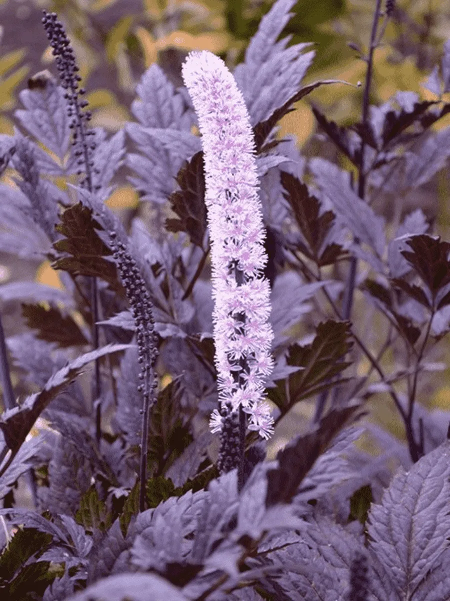 Клопогон ветвистый сорта *Pink Spike* — величественное растение с мощной вертикальной структурой, достигающее высоты до полутора метров. Его крупные пальчато-рассечённые листья тёмно-зелёного оттенка образуют пышную крону, создавая густое тенистое укрытие. Цветки собраны в эффектные пирамидальные соцветия длиной около полуметра, украшенные множеством мелких цветков нежнейшего розово-пурпурного цвета, словно тонкие кисточки акварели, плавно переходящие от светлых оттенков основания к насыщенным тонам верхушки. Растение предпочитает полутень и влажные плодородные почвы, прекрасно чувствует себя в садах средней полосы России, где становится украшением осеннего ландшафта благодаря длительному периоду цветения, продолжающемуся с конца лета вплоть до первых заморозков.
