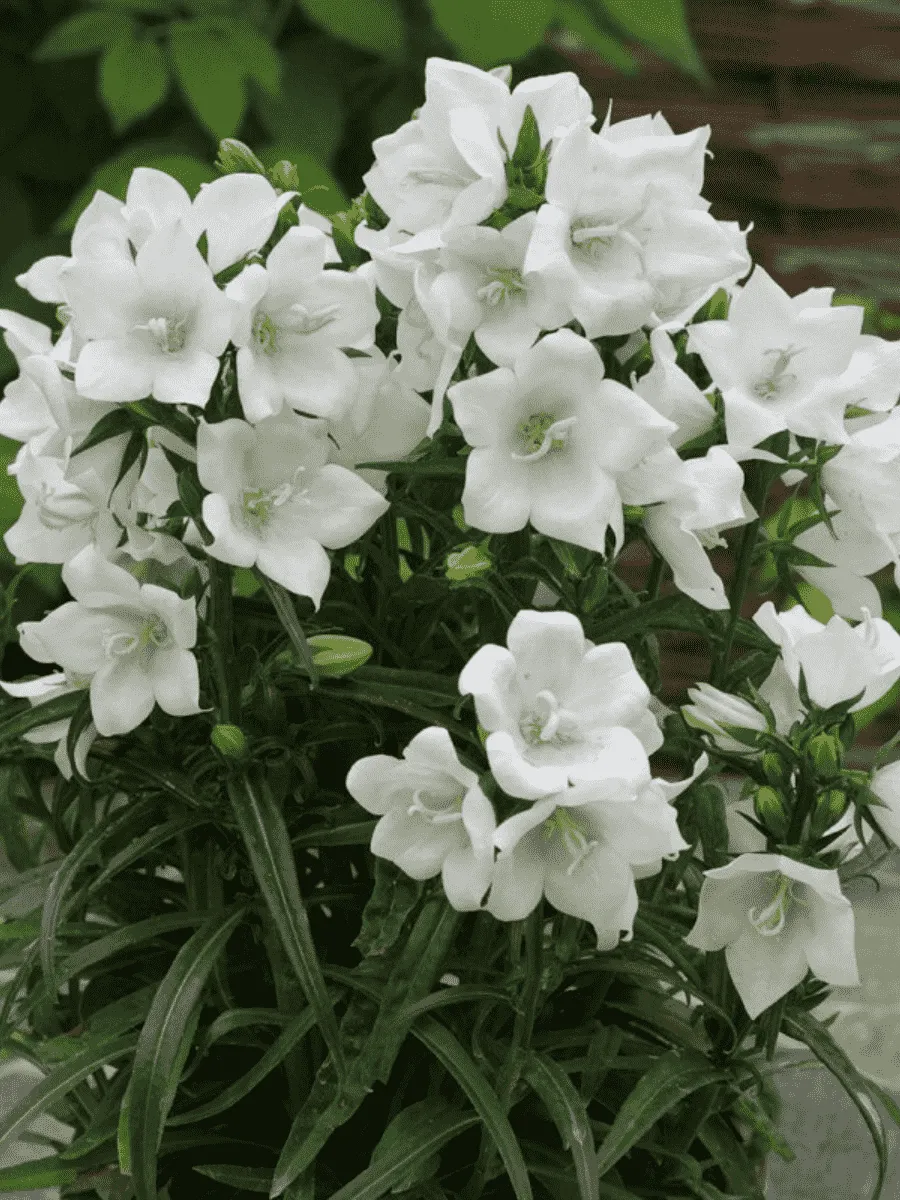 Колокольчик персиколистный сорта *Takion White* пленяет взор своей утончённой красотой и нежностью форм. Это многолетнее травянистое растение достигает высоты около полуметра, обладая прямостоячими стеблями, покрытыми мягкими волосками. Листья продолговато-ланцетной формы, слегка зубчатые по краям, напоминают очертания лепестков персика, отчего сорт и получил своё название. Верхние листья мельче нижних, создавая гармоничную градацию зелёного оттенка от насыщенного до светло-зелёного. Цветки собраны в рыхлые кистевидные соцветия, свисающие подобно миниатюрным колокольчикам, обращённым вниз. Белоснежная окраска цветков подчёркивает чистоту и свежесть облика растения, делая его особенно привлекательным в тенистых уголках сада. Период цветения продолжительный, начинается в июне и длится до конца июля, украшая собой лесные поляны, парки и сады средней полосы России. Благодаря неприхотливости и устойчивости к неблагоприятным условиям, этот колокольчик широко распространён среди садоводов любителей, предпочитающих создавать живописные композиции с участием природных растений.