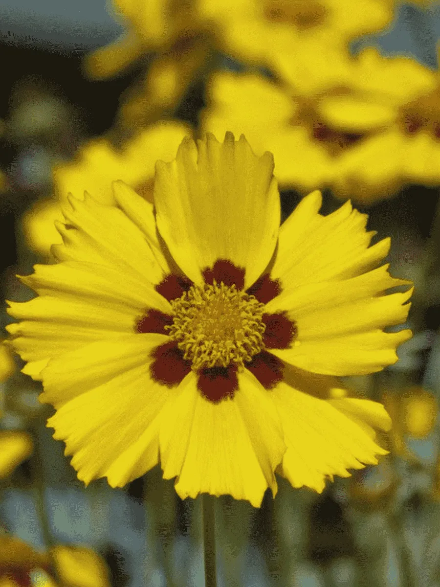 Кореопсис гибридный сорта *Tequila Sunrise* пленяет взор яркими солнечными красками и утончённой грацией облика. Это многолетнее растение достигает высоты около полуметра, формируя компактную кустистую крону с прямыми прочными стеблями. Листья линейно-ланцетной формы, светло-зелёные, слегка шероховатые на ощупь, придают растению свежесть и лёгкость. Но истинная красота раскрывается во время цветения: крупные махровые соцветия диаметром до восьми сантиметров сияют оттенками от золотисто-жёлтого до насыщенно-оранжевого цвета, словно лучи утреннего солнца, отражённые в бокале текилы. Цветки украшены тонкими лучистыми лепестками, плавно переходящими от светлых оттенков к тёмному центру, создавая эффект мерцания и глубины. Период цветения продолжительный, начинается в июне и длится до поздней осени, радуя садоводов пышностью и жизнерадостностью красок. Растёт корейопсис быстро, легко адаптируется к различным условиям, предпочитая солнечные места и плодородные почвы, распространяя вокруг себя атмосферу тепла и радости.