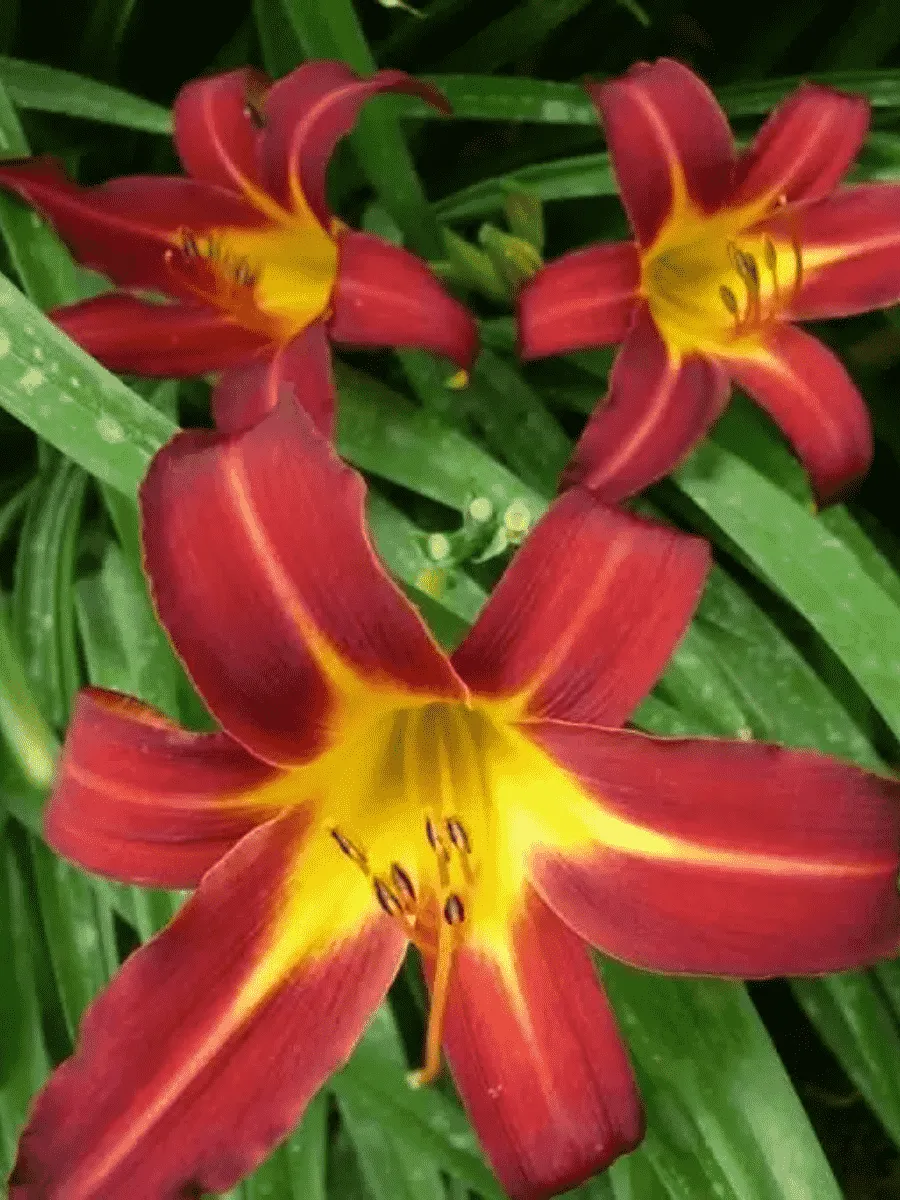 Лилейник *Autumn Red* пленяет взор роскошной зеленью длинных узких листьев, собранных в пышную прикорневую розетку, словно живописная зелёная грива, струящаяся от основания стебля. Цветоносы устремляются вверх стройными колоннами высотой до метра, увенчанные крупными бутонами, раскрывающимися в великолепие бархатистых цветков насыщенного красно-коричневого оттенка с золотистым горлом. Лепестки слегка волнистые, элегантно изгибаются наружу, подчёркивая изысканность формы цветка. Период цветения растянутый, начинается летом и продолжается вплоть до осени, радуя садоводов долгим декоративным эффектом. Растёт лилейник мощно, быстро разрастаясь в крупные куртины, легко адаптируясь к различным условиям произрастания, предпочитая солнечные места и плодородные почвы.