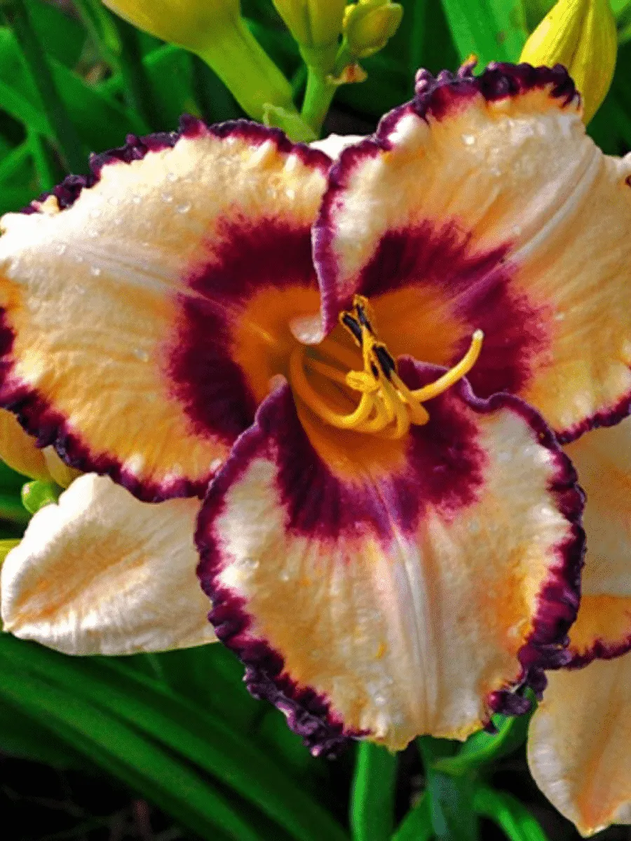 светло кремовые лепестки а в жару практически белые с пронзительным темно сливовым горлом и двойной каймой