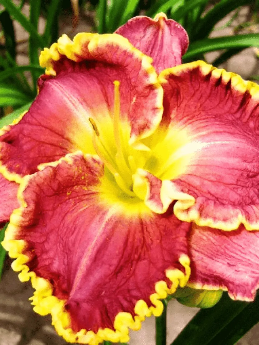 Лилейник **Daria** пленяет взор нежностью кремово-белых лепестков, украшенных золотисто-жёлтыми штрихами и тонкой каймой насыщенного оранжевого цвета, словно художник бережно провёл кистью по краю каждого цветка. Листья длинные, узколинейные, ярко-зелёные, слегка дугообразно изгибаются от основания розетки, придавая растению элегантную воздушность и лёгкость. Цветоносы высокие, стройные, несут несколько крупных цветков, раскрывающихся один за другим, продлевая период цветения до нескольких недель. Растёт лилейник компактной розеткой, постепенно разрастаясь в живописные куртины, прекрасно вписываясь в ландшафт сада благодаря своей неприхотливости и устойчивости к неблагоприятным условиям среды.
