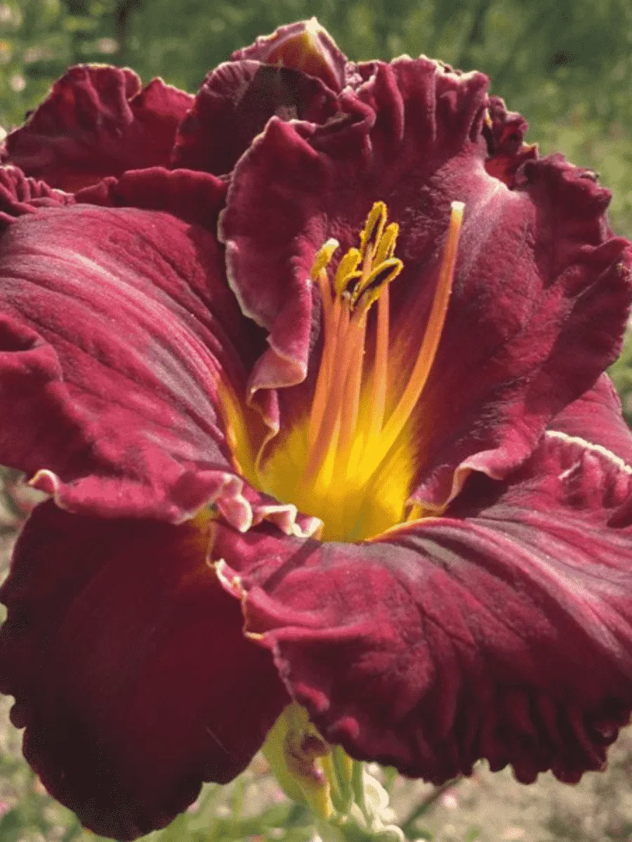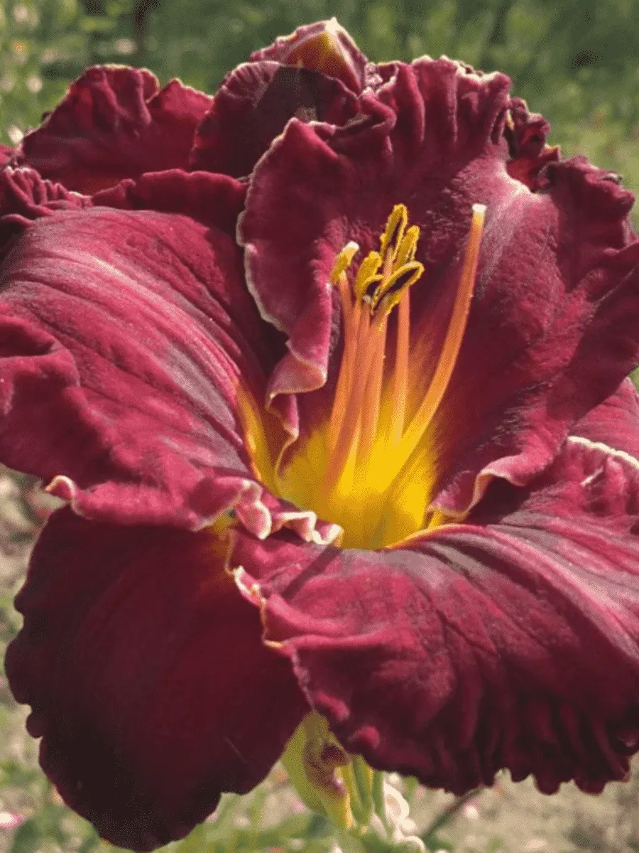 Лилейник *Purplelicious* пленяет взор роскошной зеленью длинных узких листьев, собранных в пышную прикорневую розетку, словно живописная зелёная волна, мягко струящаяся от основания стебля. Цветоносы устремляются вверх стройными стрелами высотой до метра, увенчанные крупными бутонами, раскрывающимися в великолепие крупных цветков диаметром около десяти сантиметров. Лепестки цветка окрашены насыщенным пурпурно-фиолетовым цветом с едва уловимым переливчатым блеском, будто драгоценность, отражающая лучи солнца. Сердцевина каждого лепестка украшена тонкой золотистой каймой, придающей особую изысканность общему облику. Период цветения длится долго, радуя глаз яркими красками с июня по август. Растение неприхотливо, устойчиво к болезням и неблагоприятным условиям среды, легко размножается вегетативно и прекрасно адаптируется практически на любых почвах, становясь украшением садов и парков, где бы ни поселилось.