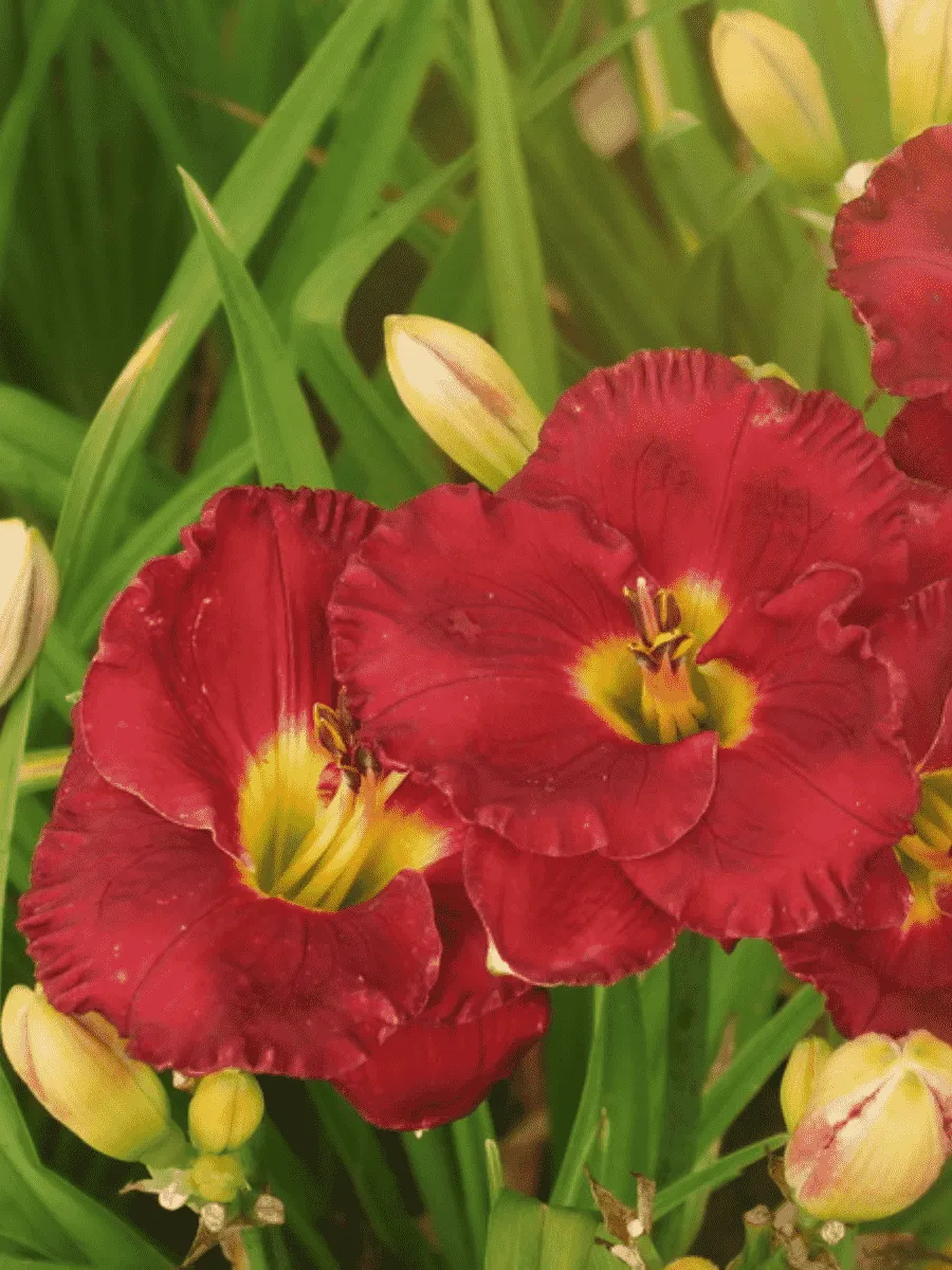Лилейник *Siloam Paul Watts* пленяет взор изысканным сочетанием благородной элегантности и природной простоты. Его широкие мечевидные листья образуют пышную розетку, словно зелёная манишка, окаймляющая основание стебля. Листья гладкие, насыщенно-зелёного цвета, слегка блестящие, придают растению ухоженный и свежий облик даже после долгих летних дней. Цветонос высотой около метра возвышается над лиственной массой, увенчанный крупными бутонами, раскрывающимися один за другим. Каждый цветок представляет собой шедевр природы: лепестки нежно-кремовые с золотистым оттенком, плавно переходящим в глубокий жёлтый центр, украшенный тонкими пурпурными штрихами, придающими особую утончённость композиции. Лепестки бархатистые, слегка волнистые по краям, создают впечатление нежнейшего шёлка. Период цветения продолжительный, растение радует глаз яркими цветами с июня до августа, постепенно сменяя распустившиеся цветки свежими бутонами. Предпочитает солнечные места, хорошо растёт на плодородных почвах, устойчиво к засухе и болезням, легко размножается корневищем, быстро формируя живописные куртины.