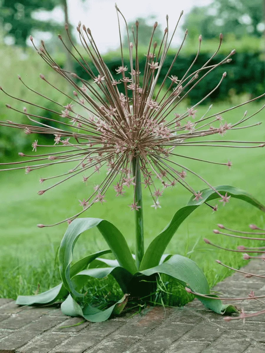 Лук декоративный Шуберта (Allium schubertii), словно живописная миниатюра природы, пленяет взор своей утончённой красотой и воздушностью форм. Тонкие, нитевидные листья образуют нежную зелёную розетку, оттеняя собой изысканный букет соцветий. Цветонос высотой до полуметра венчается огромным шаровидным зонтиком диаметром около двадцати сантиметров, состоящим из сотен крошечных звёздчатых цветков нежно-розового оттенка, плавно переходящего от центра к краям в насыщенный пурпурный тон. Каждый цветок будто парит над поверхностью земли, создавая иллюзию невесомости и лёгкости. Растение предпочитает солнечные участки и хорошо дренированные почвы, распространено преимущественно в горных районах Средней Азии, где оно украшает каменистые склоны и степи своими сказочными цветами ранней весной.