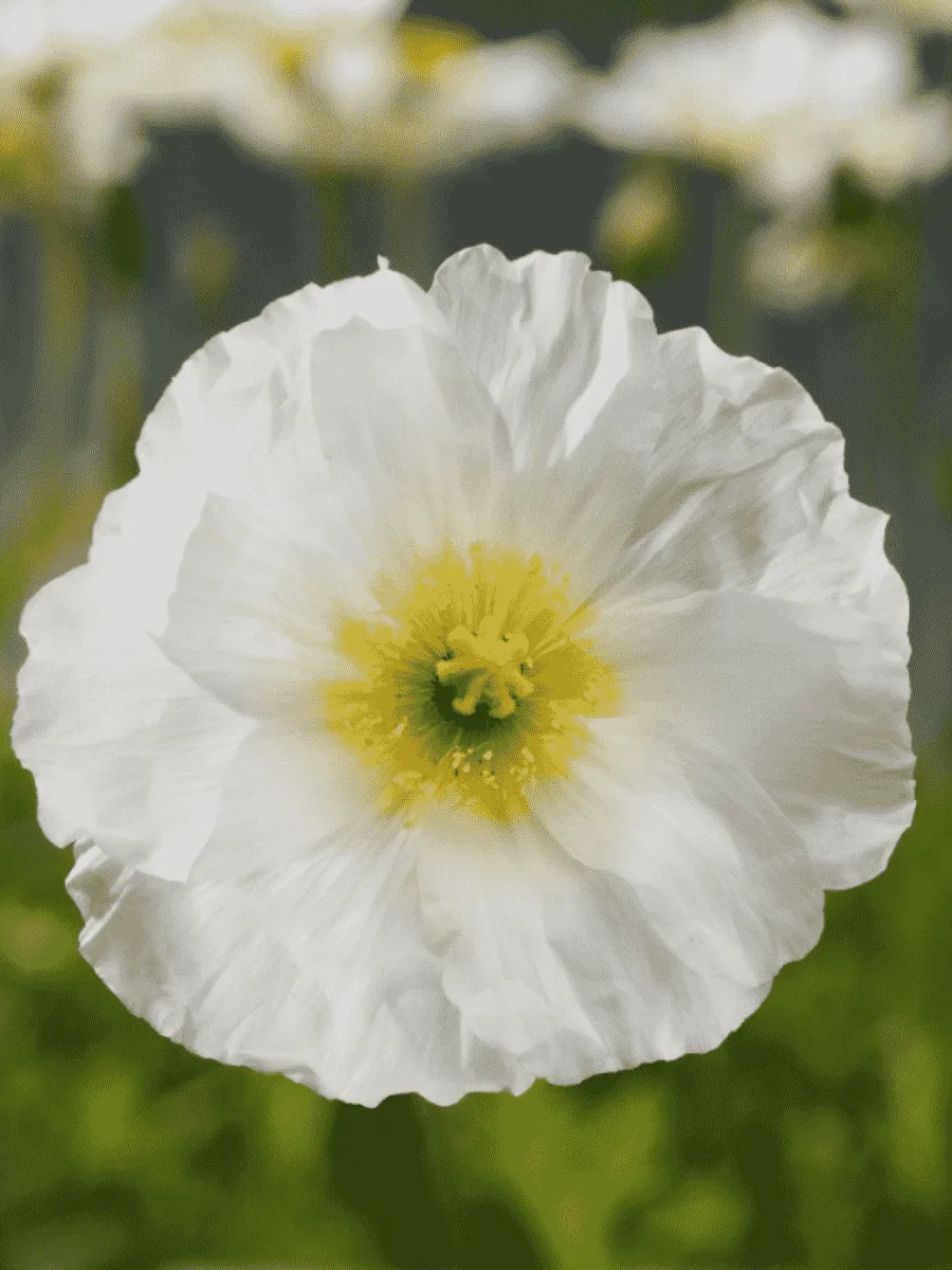 Мак Pop-up White — нежная однолетняя культура семейства маковых, пленяющая взор своей утончённой красотой и воздушностью облика. Стройные стебли высотой до полуметра несут крупные серебристо-зелёные листья, рассечённые на узкие сегменты, словно кружевной покров, окутывающий растение от корней до вершины. Цветки раскрываются внезапно, будто вспыхивая белоснежным пламенем среди зелени, демонстрируя идеальную симметрию чашелистиков и лепестков, идеально ровную поверхность которых украшена едва заметным шелковистым блеском. Сердцевина цветка представлена золотистыми тычинками, собранными в аккуратный пучок, придающий особую изысканность композиции. Растёт быстро, легко размножается самосевом, создавая живописные островки чистоты и свежести на клумбах, лугах и полях, где бы ни оказался этот хрупкий посланник весны и лета.