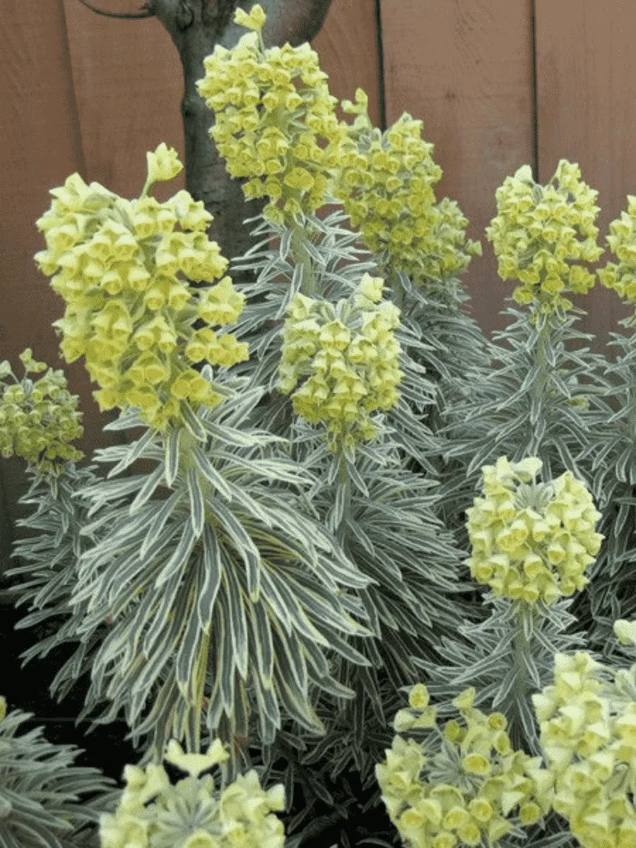 Молочай миндалевидный сорта *Tasmanian Tiger* представляет собой эффектную декоративную разновидность, поражающую своей изысканной красотой и необычностью облика. Это компактное растение с прямостоячими побегами высотой до полуметра, покрытыми густым слоем мелких игольчатых колючек, придающих растению особую строгость и элегантность. Листья миндалевидные, плотные, кожистые, расположены супротивно вдоль стебля, создавая гармоничную симметрию формы. Их уникальная особенность заключается в оригинальной пёстрой окраске: листья украшены контрастной серебристо-белой каймой, окаймляющей тёмно-зелёную сердцевину листа, благодаря чему молочай выглядит особенно нарядно и привлекательно даже вне периода цветения. Цветёт редко, мелкими жёлтоватыми соцветиями, однако именно листва является главным украшением этой декоративной культуры. Растение предпочитает солнечные места, хорошо переносит засуху и легко адаптируется к различным почвенным условиям, широко используется в ландшафтном дизайне для создания ярких акцентов и декоративных композиций.