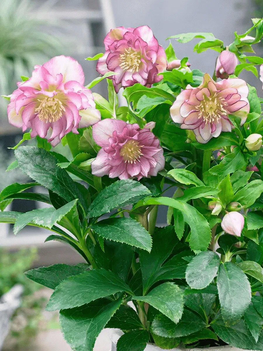 Морозник восточный сорта *Pink Double* — изысканное растение семейства лютиковых, покоряющее сердца садоводов нежностью цветения даже среди зимних холодов. Его плотная розетка крупных кожистых тёмно-зелёных листьев украшена глубокими зубчатыми краями и глянцевым блеском, придающим особую декоративность растению круглый год. Цветки морозника распускаются ранней весной, когда ещё лежит снег, удивляя крупными махровыми бутонами нежно-розового оттенка, переходящего от светлого до насыщенного тона в зависимости от освещения и возраста цветка. Лепестковидные чашелистики собраны в пышную округлую шапочку диаметром около пяти сантиметров, создавая впечатление миниатюрной розы. Высота взрослого куста достигает тридцати-сорока сантиметров, а диаметр розетки листьев — примерно столько же. Растёт медленно, предпочитая полутень и влажные плодородные почвы, размножается семенами и делением корневища. Благодаря своей зимостойкости и неприхотливости морозник восточный *Pink Double* становится украшением теневых уголков сада, радуя глаз первыми весенними красками после долгой зимы.