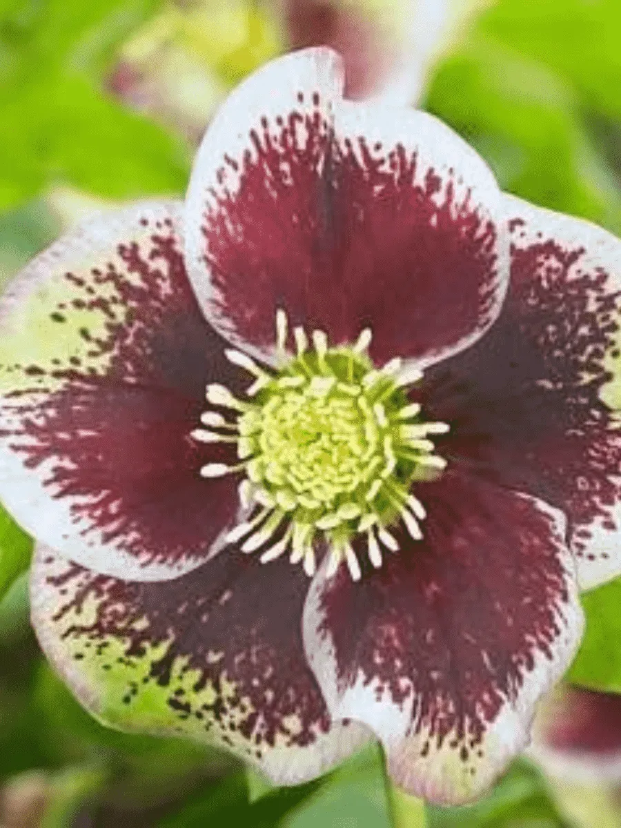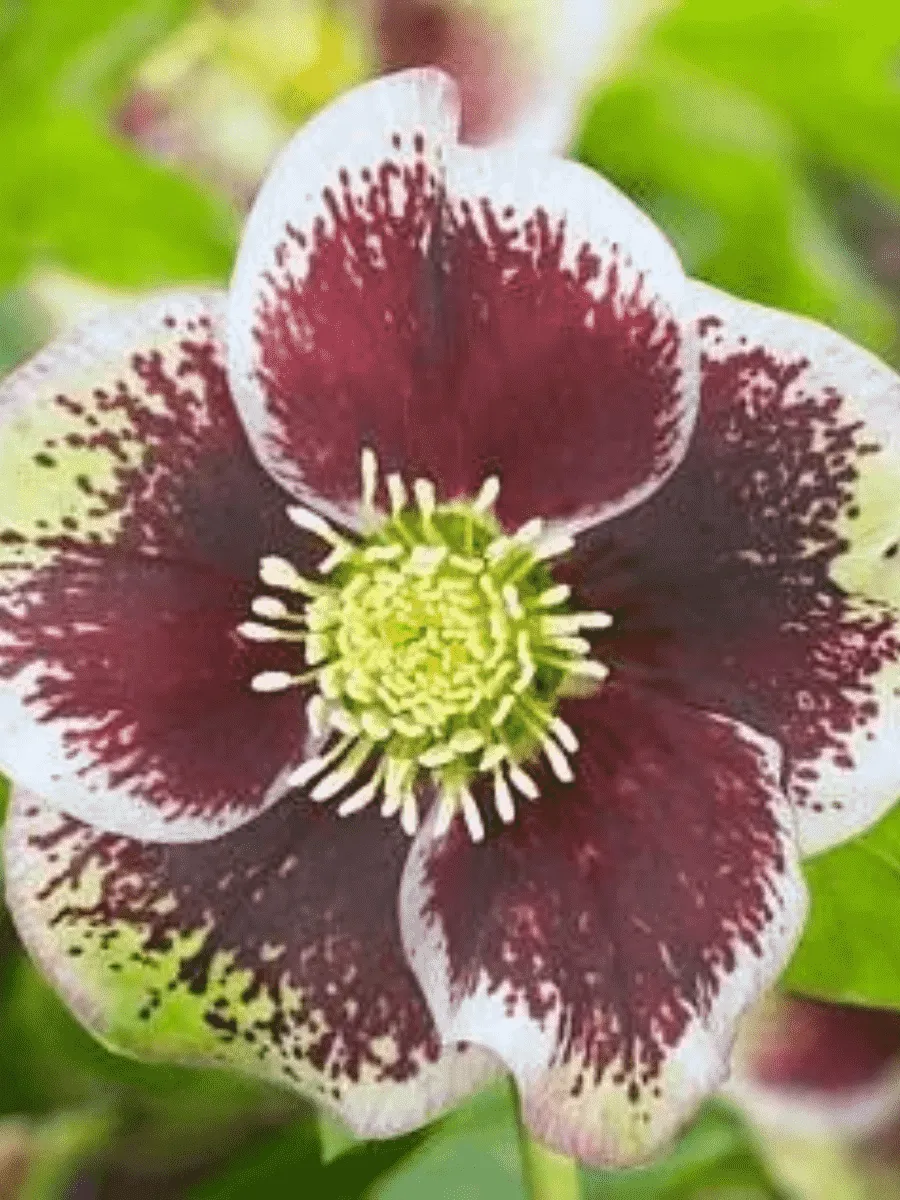 Морозник восточный сорта *Pretty Ellen Spotted* пленяет взор изысканным сочетанием благородной простоты и утончённой декоративности. Это многолетнее травянистое растение высотой около 45–60 см образует компактную розетку крупных кожистых тёмно-зелёных листьев с волнистыми краями, украшенных серебристо-белым мраморным узором. Листья плотные, блестящие, слегка гофрированные, придают растению особую элегантность даже вне периода цветения. Цветки появляются ранней весной, когда природа ещё погружена в зимнюю дремоту, раскрываясь крупными чашевидными бутонами диаметром до 10 см. Лепестки кремово-жёлтые с нежными пурпурными пятнышками, придающими цветкам неповторимую живописность и очарование. Сердцевина цветка насыщенно-оранжевая, контрастирующая с лепестковой поверхностью и подчёркивающая природную гармонию оттенков. Растёт морозник медленно, формируя аккуратные куртины, устойчивые к холодам и тенелюбивые, предпочитающие плодородные влажные почвы лесных полян и садов.