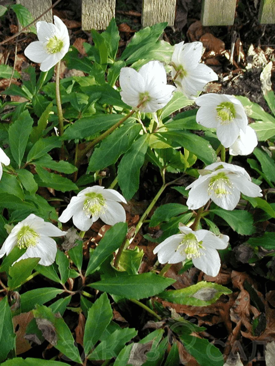 Морозник восточный сорта *White Lady* — изысканное растение семейства лютиковых, покоряющее сердца садоводов своей зимостойкостью и нежностью цветения. Изящная розетка кожистых тёмно-зелёных блестящих листьев украшена крупными белыми цветами, словно снежинки, застывшие среди зимы. Листья морозника имеют глубокую рассечённую форму, создавая эффектную контрастность между гладкой поверхностью и резной кромкой. Цветки появляются рано весной, когда большинство растений ещё дремлет под снегом, раскрываясь широкими чашевидными бутонами с кремово-белым оттенком лепестков и золотистыми тычинками внутри. Высота взрослого куста достигает около 45 см, диаметр розетки листьев — до 60 см. Растёт медленно, предпочитая полутень и влажные плодородные почвы, прекрасно адаптируясь к условиям средней полосы России. Этот благородный многолетник станет украшением тенистого сада, радуя глаз своим ранним цветением и элегантностью форм даже после окончания сезона.