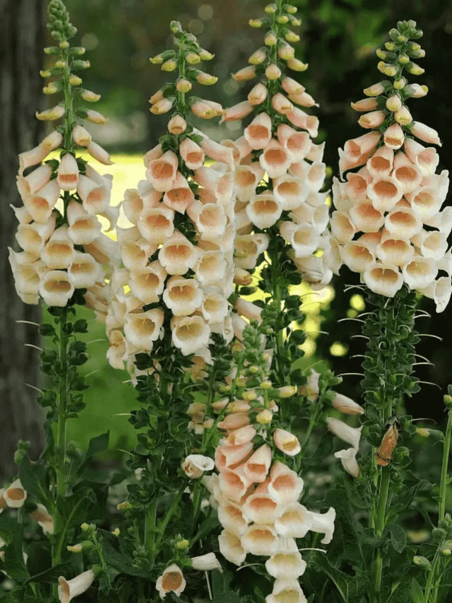 Наперстянка пурпурная сорта *Dalmatian Peach* пленяет взор нежностью пастельных оттенков и утончённой грацией облика. Её высокие стройные стебли достигают метра высоты, увенчанные пирамидальными соцветиями, состоящими из множества трубчатых цветков нежно-персикового цвета с едва заметной розоватостью и тонкими фиолетовыми штрихами внутри венчика. Листья крупные, тёмно-зелёные, слегка морщинистые, овально-ланцетные, расположены супротивно вдоль всего стебля, создавая эффектную контрастность между насыщенной зеленью листвы и воздушностью цветов. Растёт наперстянка преимущественно на солнечных участках, предпочитая плодородные почвы умеренного климата Европы и Азии, где её яркие кисти украшают сады и парки, радуя глаз своей изысканной красотой и элегантностью форм.