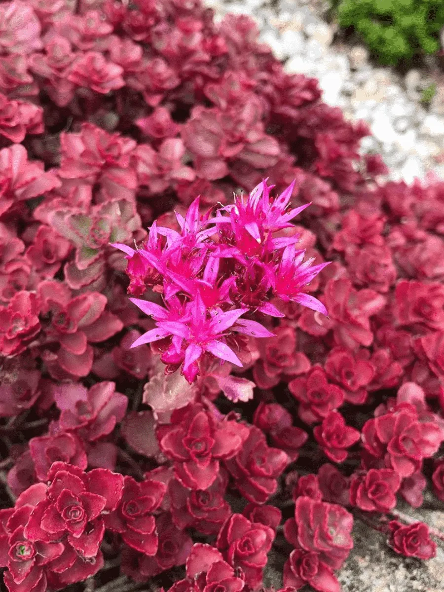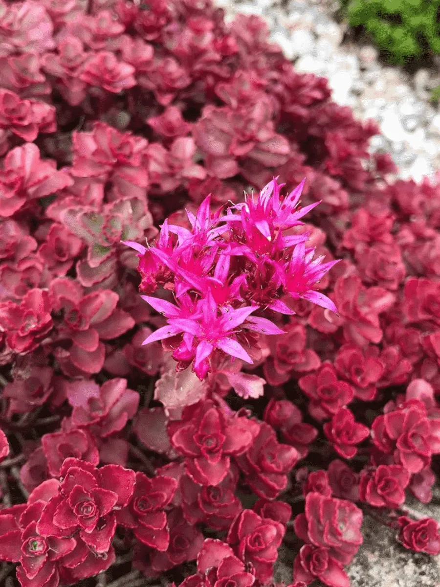 Очиток ложный 'Dragon’s Blood' (Sedum spurium 'Dragon’s Blood') — эффектное почвопокровное растение с плотными розовато-красными листьями, словно покрытыми тонкой патиной благородной меди. Листья мелкие, округлые, слегка мясистые, густо покрывают стелющиеся побеги, создавая живописную красноватую мозаику. Цветки собраны в плоские щитковидные соцветия, окрашены насыщенно-розовым цветом, оттеняя яркую зелень окружающего ландшафта. Растение отличается неприхотливостью, устойчивостью к засухе и холоду, быстро разрастается, формируя плотный ковёр, который особенно декоративен осенью, когда листья приобретают интенсивный багряный оттенок. Благодаря своей выносливости и привлекательному внешнему виду очиток ложный широко используется в садовом дизайне, украшая альпийские горки, каменистые сады и бордюры.