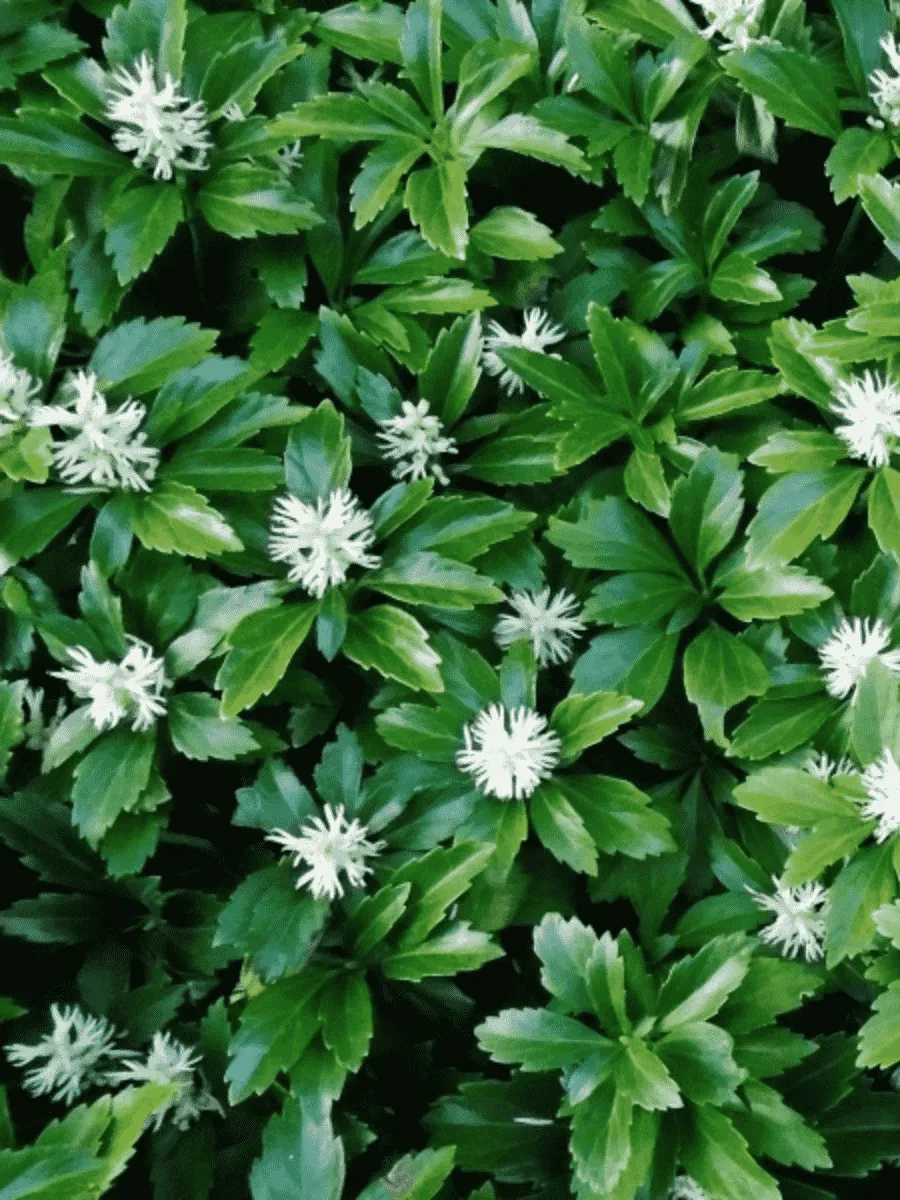 Пахизандра верхушечная — вечнозелёный кустарник родом из Восточной Азии, обладающий густой приземистой кроной и стелющимися побегами, достигающими высоты до полуметра. Листья крупные, кожистые, блестящие, яйцевидной формы с закруглённым кончиком, тёмно-зелёной окраски сверху и слегка светлее снизу, расположенные мутовчато вокруг стебля, создавая плотную зелёную шапочку. Весной растение покрывается мелкими белыми цветами, собранными в рыхлые зонтичные соцветия, придающие кусту нежность и воздушность. Растёт медленно, предпочитая полутень и влажные плодородные почвы, широко используется в ландшафтном дизайне благодаря своей декоративности круглый год и способности создавать густые почвопокровные ковры даже в тенистых местах сада.