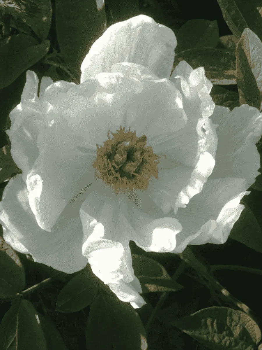 Пион древовидный сорта *White* представляет собой величественное многолетнее растение с мощной древеснеющей корневой системой и прочными прямостоячими побегами высотой до полутора метров. Его крупные листья рассечены на узколанцетные сегменты, создавая ажурную зелёную крону, переливающуюся нежными оттенками изумруда и серебра. Цветки распускаются поздней весной или ранним летом, поражают своей белоснежной чистотой и идеальной формой, словно фарфоровые чаши, наполненные солнечным светом. Лепестки гладкие, шелковистые, слегка волнистые по краям, источающие тонкий аромат, привлекающий насекомых-опылителей. Растёт пион медленно, ежегодно прибавляя несколько новых ветвей, постепенно формируя пышный куст, который способен радовать глаз десятилетиями. Предпочитает солнечные места с плодородной почвой, устойчив к морозам и засухе, широко используется в ландшафтном дизайне парков и садов благодаря своему благородному облику и длительному периоду декоративности.