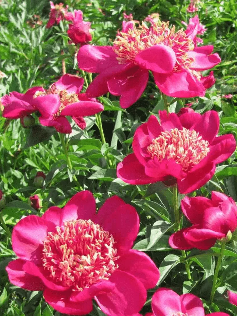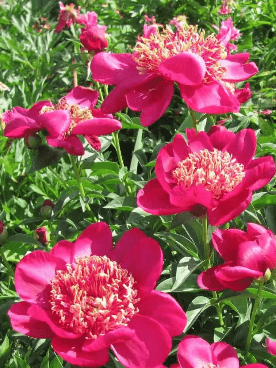 Пион травянистый сорта *Nippon Beauty* пленяет взор роскошью цветения и благородством облика. Его мощные прямостоячие стебли достигают высоты до одного метра, увенчанные крупными темно-зелеными листьями сложной формы, состоящими из множества узких долек, придающих растению особую декоративность даже вне периода цветения. Цветки крупные, диаметром около десяти сантиметров, махровые, насыщенно-красной окраски с золотистыми тычинками, источают тонкий аромат, привлекающий внимание насекомых-опылителей. Период цветения приходится на май–июнь, когда пышные соцветия эффектно выделяются среди зелени сада. Растёт пион медленно, формируя компактную кустистую крону, устойчив к болезням и неблагоприятным погодным условиям, предпочитает солнечные места и плодородные почвы. Этот сорт широко распространён в ландшафтном дизайне благодаря своей неприхотливости и долговечности, украшая сады и парки долгие годы своим великолепием.