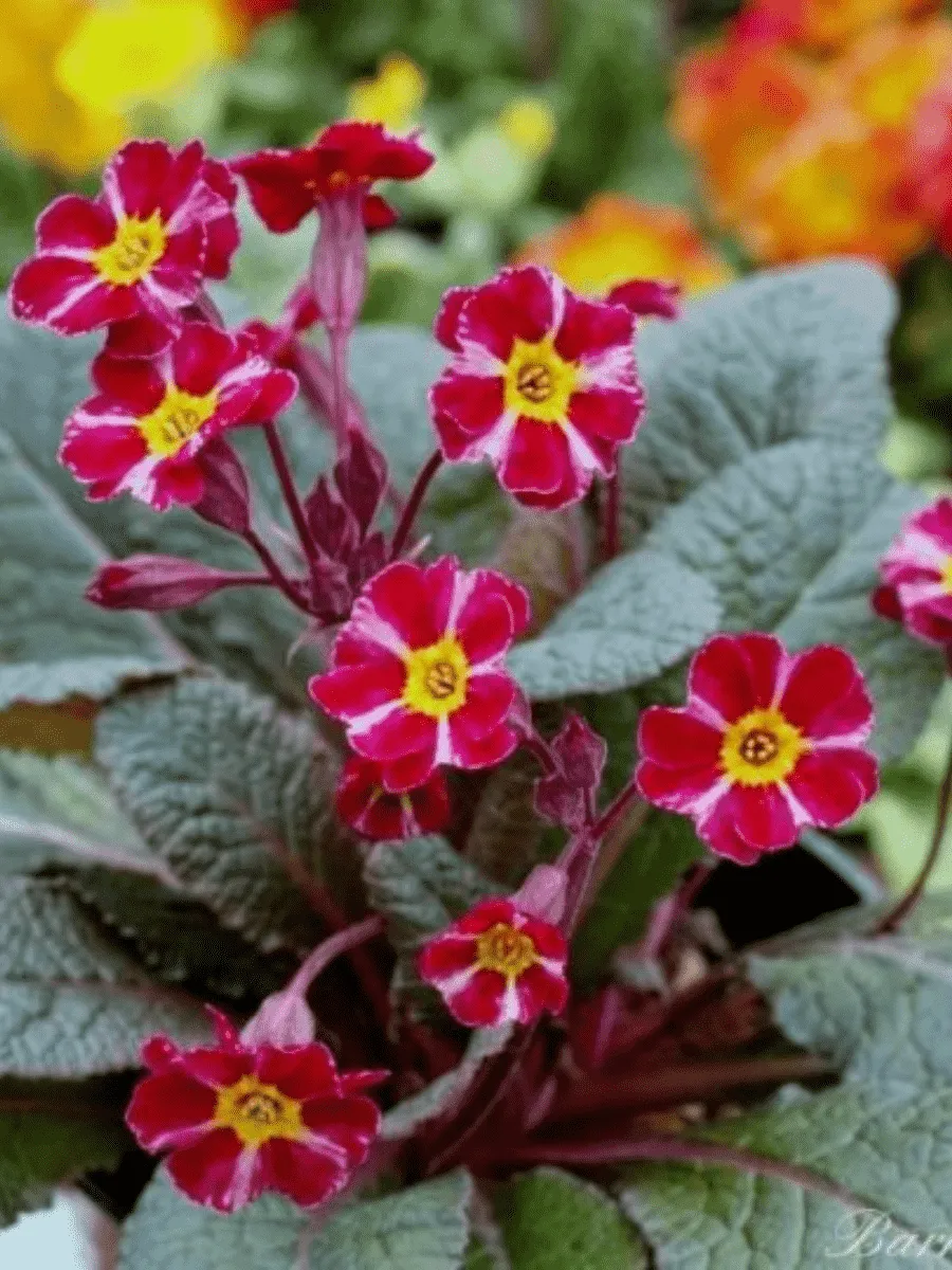 Примула гибридная сорта *Dark Rosaleen* пленяет взор изысканным сочетанием благородной простоты и утончённой элегантности. Её компактные кустики высотой около двадцати сантиметров украшены округлыми листьями насыщенного тёмно-зелёного цвета, слегка волнистыми по краям и покрытыми нежным пушком, придающим растению бархатистость и загадочность. Цветки собраны в пышные зонтики, возвышающиеся над листвой на длинных прочных стеблях. Лепестки цветков глубокого винно-красного оттенка переливаются оттенками рубина и граната, создавая впечатление драгоценных камней, сверкающих среди зелени. Бутоны раскрываются постепенно, продлевая период цветения до нескольких недель, наполняя сад чарующим ароматом весны. Растёт примула неприхотливо, предпочитая полутень и влажную плодородную почву, легко размножается делением куста и семенами, быстро формируя живописные группы, радующие глаз своей красотой и свежестью.