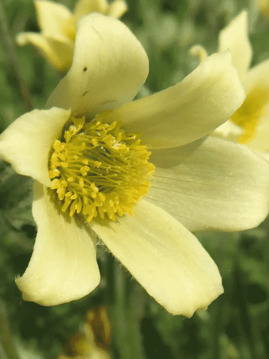 Прострел албанский (Pulsatilla albana) — изысканное травянистое растение семейства лютиковых, покоряющее сердца любителей природы своей утончённой красотой и нежностью форм. Стройные стебли высотой до тридцати сантиметров несут крупные прикорневые листья, рассечённые на узкие сегменты, словно кружевная манжета, окутывающая основание цветка. Листья покрыты мягким серебристым пушком, придающим растению загадочный блеск и подчёркивающим хрупкость облика. Цветки одиночные, широко раскрытые, диаметром около пяти-семи сантиметров, венчают собой тонкие побеги, слегка склоняющиеся от собственной тяжести. Лепестковидные чашелистики окрашены в благородную гамму оттенков от нежно-кремового до светло-жёлтого цвета, переходящего ближе к центру в золотисто-лимонный тон. Тычинки многочисленные, длинные, жёлтые, контрастируют с бархатисто-зелёной поверхностью пестиков, создавая впечатление мягкого сияния внутри цветка. Период цветения приходится на апрель-май, когда прострел раскрывается навстречу весеннему солнцу, наполняя воздух тонким ароматом свежести и чистоты. Растёт преимущественно на каменистых склонах, известняковых осыпях и сухих лугах Балканского полуострова, предпочитая солнечные места с хорошо дренированной почвой.