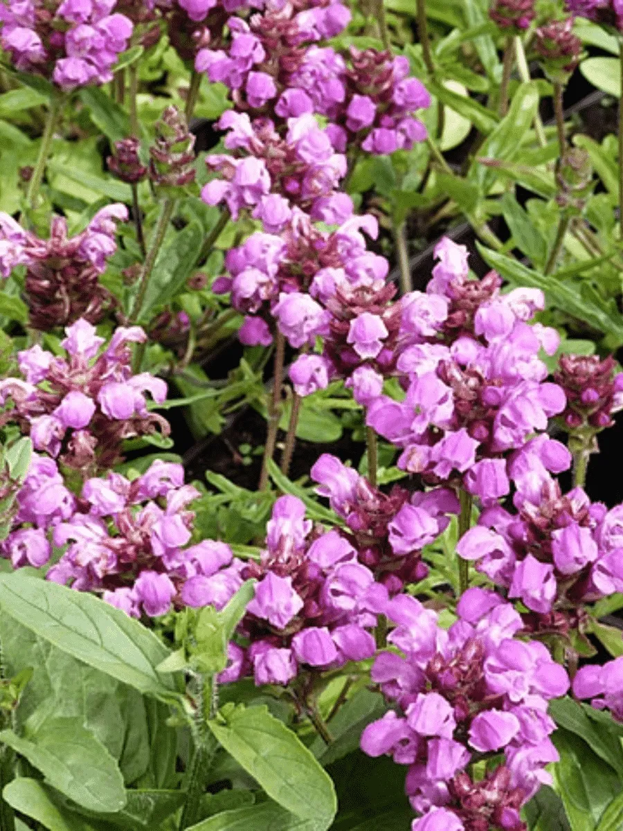 Прунелла крупноцветковая сорта *Bella Rose* пленяет взор нежностью своего облика и утончённостью форм. Это многолетнее травянистое растение образует компактную розетку прикорневых листьев, имеющих сердцевидную форму и слегка волнистые края, покрытые бархатистым пушком, придающим листве особую мягкость и привлекательность. Стебли прямостоячие, крепкие, несут крупные цветки, собранные в плотные колосовидные соцветия, возвышающиеся над листьями подобно изысканным свечкам. Лепестки цветков окрашены в насыщенный пурпурно-розовый оттенок, переходящий в тёмно-фиолетовые тона ближе к центру венчика, создавая впечатление благородной градации цветов. Цветение продолжительное, начинается в конце весны и длится до середины лета, наполняя сад чарующим ароматом и привлекая внимание своей элегантностью и простотой линий. Растёт медленно, предпочитая солнечные участки с плодородной почвой, легко адаптируется к различным условиям выращивания, радуя садоводов своим декоративным видом долгие годы.