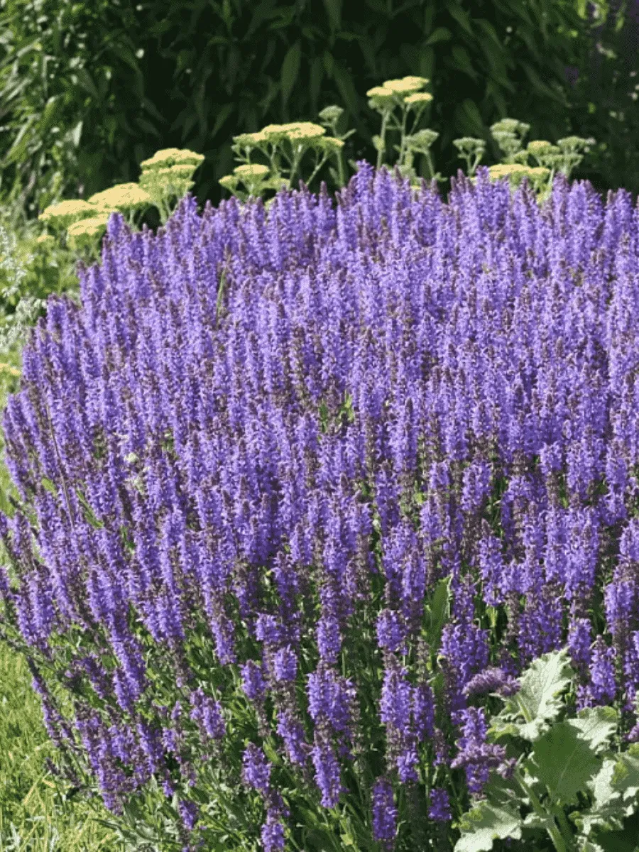 Шалфей дубравный сорта *Blaukonigin* пленяет взор своей благородной красотой и утончённостью форм. Это многолетнее травянистое растение достигает высоты около полуметра, формируя компактную кустистую крону с прямостоячими стеблями, покрытыми нежнейшими волосками. Листья крупные, сердцевидные, слегка морщинистые, тёмно-зелёного цвета с серебристым отливом, словно украшенные тонкой паутинкой света. Цветки собраны в плотные колосовидные соцветия, возвышающиеся над листвой подобно королевским коронам. Их лепестки окрашены глубоким насыщенным сине-фиолетовым цветом, оттенённым пурпурными прожилками, создавая впечатление изысканной драгоценности среди зелени сада. Период цветения продолжительный, начинается в июне и длится до конца лета, наполняя пространство тонким ароматом пряных трав и свежести лесной чащи. Растёт шалфей свободно, легко адаптируясь к различным условиям, предпочитая солнечные места и умеренно влажные почвы, распространяя вокруг себя атмосферу спокойствия и гармонии природы.