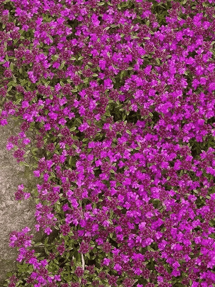 Тимьян ранний *Creeping Red* — очаровательное почвопокровное растение с нежной листвой изумрудно-зелёного оттенка, украшенной красноватыми прожилками и краями, придающими растению особую декоративность. Его миниатюрные листья овальной формы густо покрывают стелющиеся побеги, создавая плотную бархатистую куртину высотой всего несколько сантиметров. Цветёт тимьян мелкими розово-лиловыми цветами, собранными в компактные соцветия-колоски, возвышающиеся над листьями подобно крошечным свечкам. Растение отличается неприхотливостью и выносливостью, прекрасно переносит засуху и мороз, быстро разрастаясь и заполняя пространство между камнями или плиткой дорожек. Благодаря своей способности плотно укрывать почву, тимьян эффективно подавляет рост сорняков, превращая садовые участки в живописные зелёно-красные ковры, радующие глаз круглый год.