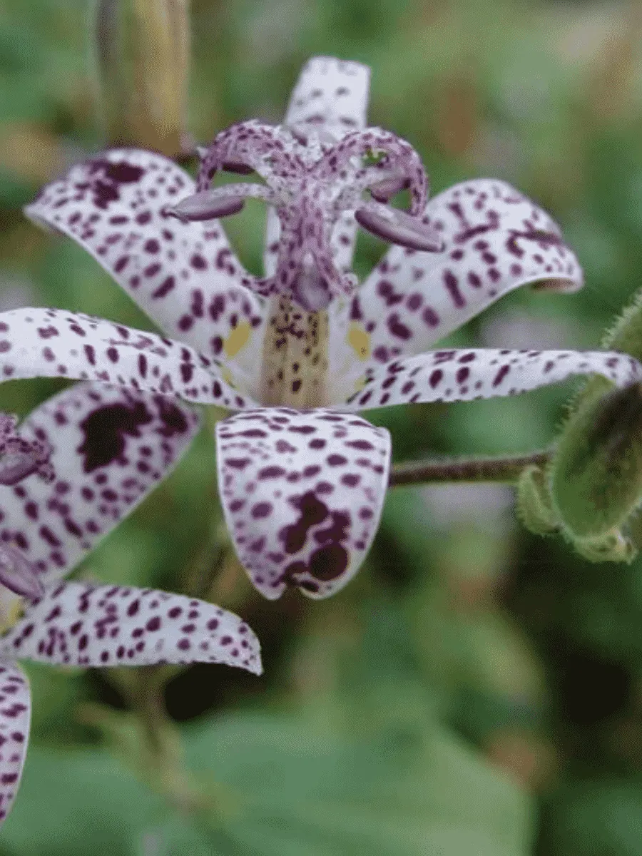 Трициртис коротковолосистый — очаровательное травянистое растение родом из Японии, обладающее изысканной красотой и утончённым очарованием. Его прямостоячие стебли достигают высоты около полуметра, украшенные узкими ланцетными листьями насыщенного зелёного цвета, слегка опушёнными нежными волосками, придающими растению бархатистый шарм. Цветки располагаются одиночно либо небольшими группами вдоль всего стебля, раскрываясь осенью яркими жёлтыми звёздочками с тёмными пятнышками внутри, словно миниатюрные солнышки среди осенней зелени. Короткий пушок покрывает лепестки, создавая впечатление мягкости и лёгкости. Растёт трициртис преимущественно во влажных тенистых местах, предпочитая лесные опушки и берега ручьёв, где находит идеальные условия для своего спокойного и гармоничного развития.