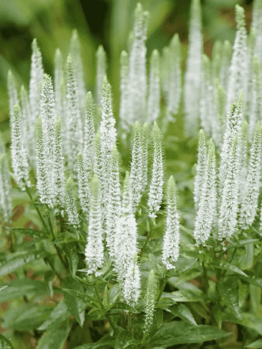 Веронника колосистая сорта *Snow Pearl* пленяет взор своей нежной белизной и утончённой грацией. Это многолетнее травянистое растение высотой около тридцати сантиметров образует компактную розетку прикорневых листьев, имеющих яйцевидную форму с мелкозубчатым краем и насыщенно-зелёный оттенок. Из центра розетки поднимаются тонкие прямостоячие стебли, увенчанные плотными цилиндрическими соцветиями-колосками длиной до десяти сантиметров. Белоснежные цветки диаметром всего несколько миллиметров собраны густо друг к другу, создавая впечатление пушистого облачка, парящего над зелёным ковром листвы. Цветёт веронника продолжительно, начиная с июня и заканчивая сентябрём, радуя глаз изысканной простотой и свежестью своего облика. Предпочитает солнечные места и умеренно влажные почвы, легко адаптируется к различным условиям произрастания, украшая сады, альпийские горки и каменистые участки своим воздушным очарованием.