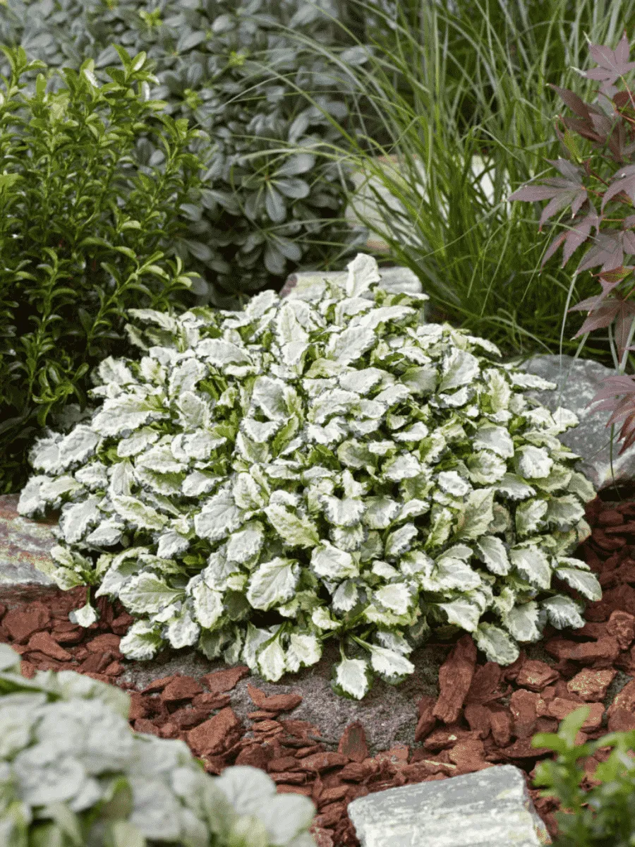 Живучка ползучая сорта *Princess Leia* пленяет взор своей изысканной красотой и нежностью форм. Это многолетнее травянистое растение образует плотные ковры изумрудной зелени, украшенные серебристо-белым узором, словно покрытые тонкой паутинкой утренней росы. Листья округлые, слегка волнистые по краям, напоминают миниатюрные сердечки, переливающиеся перламутром на солнце. Цветки мелкие, нежно-голубые, собраны в небольшие соцветия-зонтики, возвышающиеся над листвой подобно крошечным звездочкам, озаряющим зеленый покров. Растение отличается стелющимся характером роста, быстро разрастаясь и укореняясь в почве, создавая живописную живую мозаику. Благодаря своим декоративным качествам и неприхотливости, оно идеально подходит для оформления альпийских горок, рокариев и бордюров, придавая садовым композициям особую утонченность и очарование.