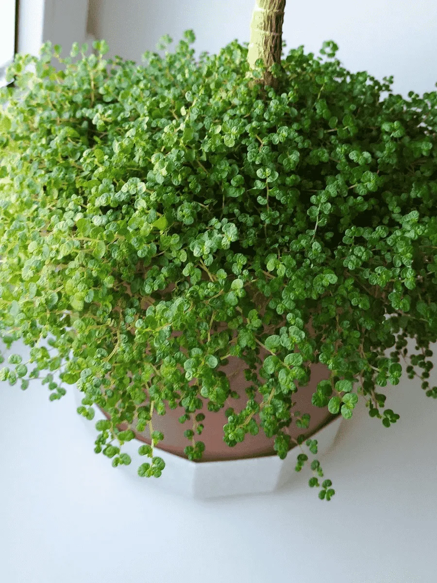 Мюленбекия спутанная (*Muehlenbeckia complexa*) — очаровательное растение семейства Гречиховых (Polygonaceae), покоряющее своей воздушностью и легкостью. Это многолетний кустарник с тонкими, гибкими побегами, переплетающимися между собой подобно кружевной ткани, создавая эффектную ажурную крону. Листья мелкие, округлые или сердцевидные, светло-зелёного оттенка, словно миниатюрные изумрудные медальоны, украшающие тонкие ветви. Цветки собраны в небольшие кисти, невзрачные, зеленовато-белые, едва заметные среди густой зелени, однако именно эта скромность делает мюленбекию особенно привлекательной благодаря её элегантному силуэту и нежности облика. Растёт быстро, легко укореняется и прекрасно адаптируется к различным условиям, от солнечных мест до полутени, предпочитая плодородные почвы умеренного климата. Благодаря своему декоративному виду и неприхотливости широко используется в ландшафтном дизайне, где служит прекрасным элементом вертикального озеленения, живым экраном или украшением альпинариев и рокариев.