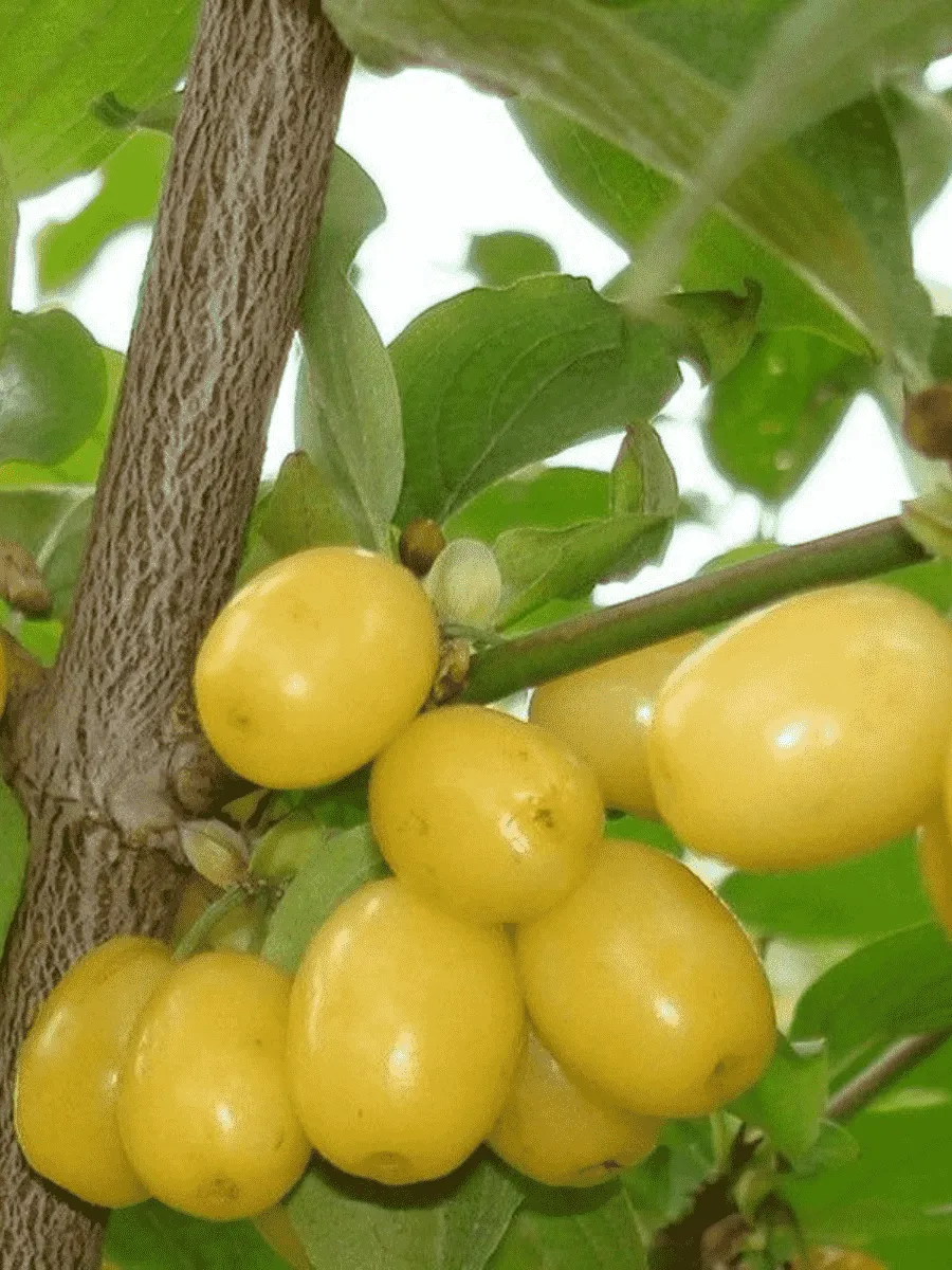 Кизил Плодовый Янтарный — стройное дерево или раскидистый кустарник высотой до пяти метров, обладающий густой кроной и гладкой серо-коричневой корой, придающей растению благородную строгость. Листья овально-продолговатые, слегка блестящие, тёмно-зелёной окраски сверху и чуть светлее снизу, осенью приобретают яркие оттенки от золотисто-жёлтого до насыщенно-красного цвета, украшая сад живописными красками осени. Цветёт растение рано весной, покрываясь мелкими жёлтыми цветами, собранными в небольшие соцветия, наполняя воздух тонким ароматом свежести и весны. Растёт медленно, предпочитая солнечные места и плодородные почвы, устойчив к засухе и морозу, широко распространён в южных регионах России, где успешно культивируется благодаря своей декоративности и полезным свойствам.