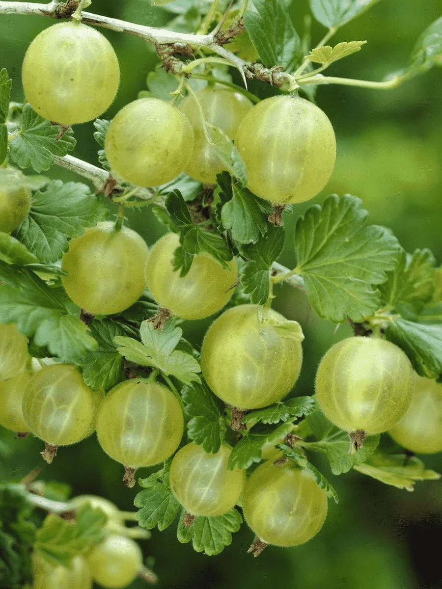 Крыжовник сорта *Hinnonmaki Green* на штамбовой форме представляет собой элегантное деревце высотой до полутора метров с раскидистой кроной и стройным прямым стволом, покрытым гладкой серо-коричневой корой. Листья крупные, округло-яйцевидные, слегка гофрированные, насыщенно-зелёной окраски, блестящие и гладкие сверху, снизу покрыты лёгким пушком. Цветёт обильно мелкими белыми цветами, собранными в небольшие кисти, источающими тонкий аромат. Растение отличается устойчивостью к болезням и неприхотливостью в уходе, прекрасно адаптируется к различным почвенным условиям и климатическим зонам умеренного пояса. Штамбовая форма придаёт крыжовнику особую декоративность, позволяя использовать его как солитерную посадку или элемент ландшафтного дизайна, подчёркивая красоту зелёного убранства сада.
