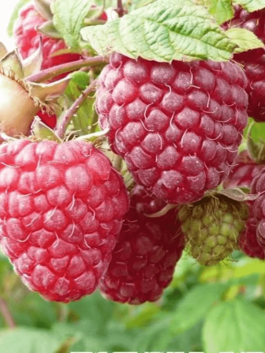 Малина ремонтантная **Полька** — элегантное растение с раскидистыми побегами, достигающими высоты до полутора метров, покрытыми мелкими шипиками, придающими ей слегка колючий облик. Листья крупные, тёмно-зелёные, матовые сверху и серовато-войлочные снизу, состоят из пяти-семи овальных листочков с зубчатыми краями, создавая живописную мозаику зелени. Цветки белые, небольшие, собраны в рыхлые кисти, распускаются обильно дважды за сезон — весной и осенью, наполняя сад нежностью своего аромата и лёгкостью лепестков. Побеги мощные, прямостоячие, быстро разрастающиеся, образуют густые заросли, способные украсить любой участок сада своей пышной зеленью и декоративностью цветения.