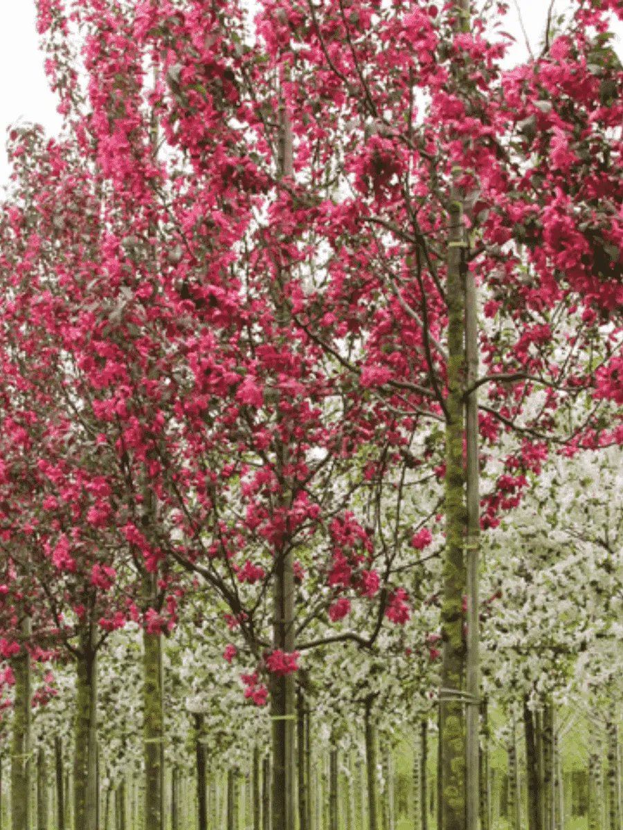 Декоративная яблоня сорта *Mokum* пленяет взор своей утончённой красотой и изысканностью форм. Это компактное дерево высотой до трёх метров обладает раскидистой кроной с тонкими гибкими ветвями, покрытыми мелкими блестящими листьями насыщенного зелёного цвета, слегка гофрированными по краям. Особого внимания заслуживает её роскошное весеннее цветение: нежнейшие розово-белые бутоны раскрываются одновременно, покрывая ветви густым облаком лепестков, словно лёгкий утренний туман. Цветки небольшие, диаметром около двух сантиметров, собраны в рыхлые соцветия, источают тонкий аромат, привлекающий насекомых-опылителей. После цветения листья приобретают бронзовый оттенок, добавляя дереву особую живописность. Растёт медленно, предпочитает солнечные места и плодородную почву, устойчива к городским условиям и зимостойка. Благодаря своим миниатюрным размерам и элегантному облику идеально подходит для небольших садов, рокариев и контейнерного озеленения.
