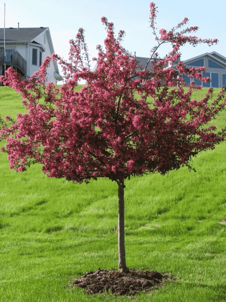Декоративная яблоня сорта *Prairy Fire* пленяет взор своей изысканной красотой и грациозностью форм. Это компактное дерево средней высоты, достигающее около пяти метров, обладает густой округлой кроной, состоящей из тонких ветвей, покрытых блестящими листьями насыщенного зелёного цвета, слегка удлинённой формы с зубчатым краем. Весной растение превращается в настоящее чудо природы: оно покрывается пышными соцветиями крупных розово-красных цветов, источающих нежнейший аромат, который привлекает внимание всех окружающих. Цветение продолжается долго, радуя глаз яркими красками вплоть до начала лета. Осенью листья приобретают огненно-оранжевый оттенок, создавая живописную картину перед наступлением зимы. Растёт медленно, предпочитая солнечные места и плодородные почвы, устойчиво переносит морозы и засуху, легко адаптируясь к различным условиям произрастания. Благодаря своим великолепным декоративным качествам широко используется в ландшафтном дизайне парков, садов и частных участков, украшая пространство утончённым очарованием и природной элегантностью.