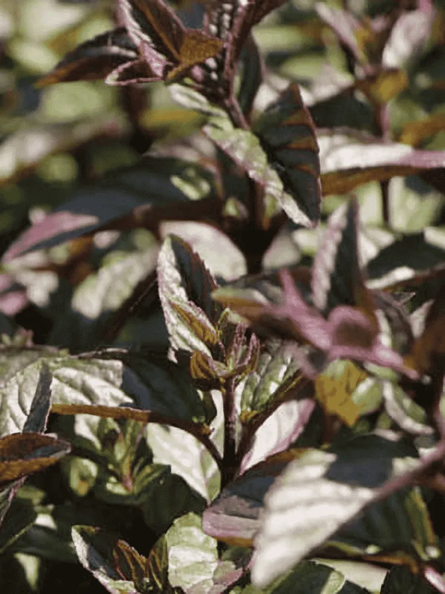Мята сорта *Chocolate* пленяет взор своей изысканной красотой и чарующим ароматом. Это многолетнее травянистое растение образует компактную розетку густых стеблей высотой до полуметра, украшенных крупными листьями насыщенного шоколадно-коричневого оттенка с бархатистым отливом и нежной зелёной каймой по краям. Листья овально-ланцетные, слегка морщинистые, покрыты мелкими волосками, придающими поверхности приятную мягкость и шелковистость. Цветёт мята обильно, покрываясь многочисленными соцветиями мелких сиренево-розовых цветков, собранных в колосовидные кисти, возвышающихся над лиственной массой. Растение предпочитает плодородные почвы и умеренное увлажнение, легко размножается корневищами и черенкованием, быстро разрастаясь и формируя живописные заросли, радующие глаз и наполняющие воздух сладким пряным благоуханием шоколада и свежей зелени.