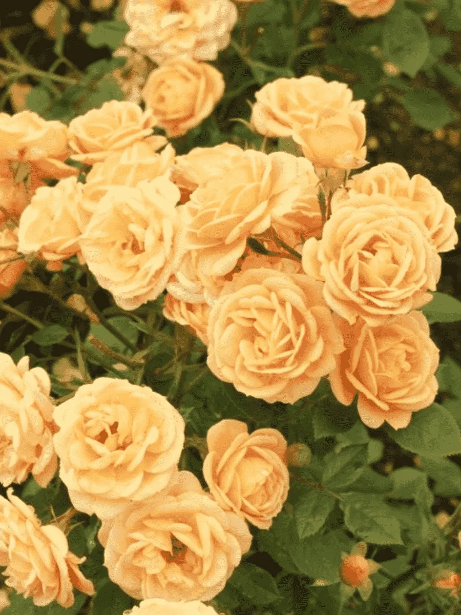Роза миниатюрная *Clementine* — очаровательное растение с компактной формой куста высотой до 45 см, украшенное мелкими листьями насыщенного тёмно-зелёного цвета, гладкими и блестящими, словно покрытыми тонким слоем воска. Цветки этой розы небольшие, диаметром около 6–8 см, собраны в пышные соцветия, состоящие из нескольких бутонов одновременно раскрывающихся нежными лепестками золотисто-жёлтого оттенка, переходящего в центр цветка в тёплые медовые тона. Лепестки слегка волнистые, многослойные, придающие цветкам особую воздушность и утончённость. Период цветения продолжительный, начинается ранней весной и продолжается практически всё лето вплоть до первых осенних заморозков. Растёт роза медленно, предпочитая солнечные места и плодородную почву, легко адаптируется к различным условиям выращивания, создавая впечатление хрупкой элегантности среди зелёного убранства сада.