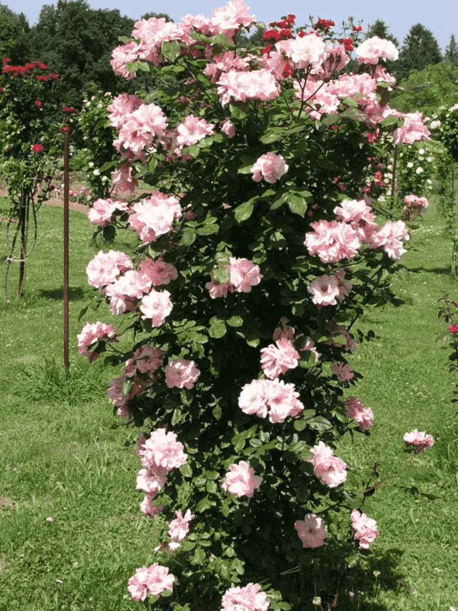 Роза плетистая *Clair Matin* пленяет взор нежностью пастельных оттенков и утончённой грацией своего цветения. Её гибкие побеги, покрытые тёмно-зелёной глянцевой листвой овальной формы с лёгким блеском, образуют живописную зелёную завесу, украшенную крупными полумахровыми цветами нежно-розового цвета с едва уловимым кремовым оттенком в центре лепестков. Бутоны раскрываются постепенно, демонстрируя свою красоту в течение длительного периода, начиная с июня и продолжаясь до поздней осени. Цветки обладают тонким ароматом, который наполняет воздух свежестью и создаёт атмосферу спокойствия и гармонии. Растение отличается быстрым ростом и способностью легко формировать пышные каскады цветов вдоль опор или стен, превращая любой садовый уголок в романтический уголок природы.